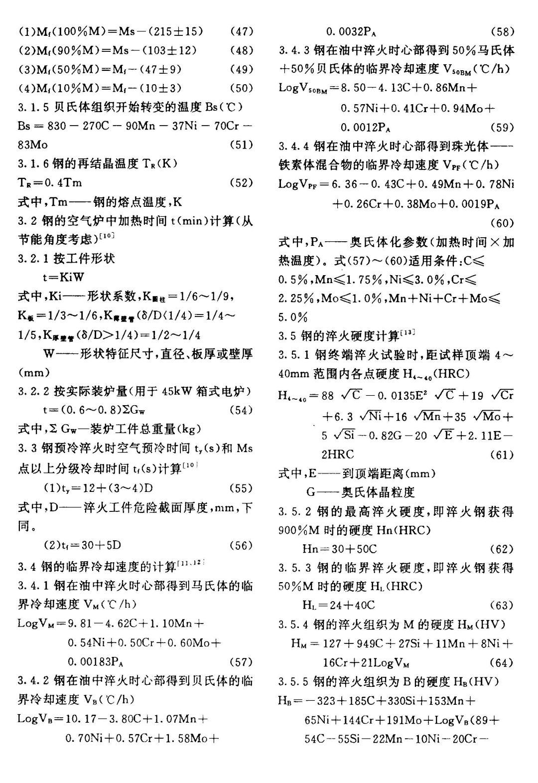 【摘要】本文主要收集整理出了鋼的力學(xué)性能及熱處理工藝經(jīng)驗(yàn)公式73個(gè)。實(shí)踐證明,所列公式具有計(jì)算方便、實(shí)用性能、可靠性能、誤差率小(≤土10%)的優(yōu)點(diǎn)。應(yīng)用經(jīng)驗(yàn)公式,可以為機(jī)械零件技術(shù)設(shè)計(jì)和制定熱處理工藝規(guī)范,提供重要的參考依據(jù),是建立鋼的力學(xué)性能及熱處理柔性系統(tǒng)(FCM)數(shù)據(jù)庫的首要前期工作之一。